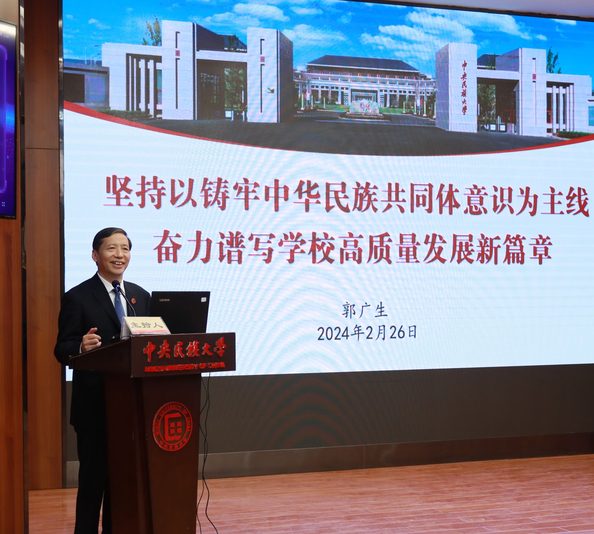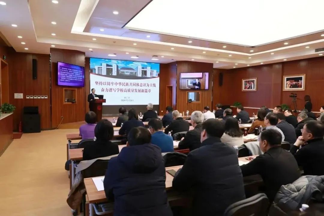 郭广生指出,2024年是中华人民共和国成立75周年,是实现“十四五”规划目标任务的关键一年,更是学校聚焦“铸牢”主线深化改革、推动高质量发展的关键一年。要深入贯彻落实习近平总书记关于加强和改进民族工作的重要思想,坚持和加强党的全面领导,坚定拥护“两个确立”、坚决做到“两个维护”;要聚焦服务强国建设和“铸牢”主线,统筹深入推进国家“双一流”和北京市新一轮“双一流”建设,实现更高质量发展;要坚持把深化改革作为根本动力,不断激发干部教师干事创业活力,形成共促学校事业高质量发展合力;要坚持把维护安全稳定作为根本前提,筑牢政治安全防线、管好校园安全、及时化解矛盾纠纷,防范各领域风险隐患。