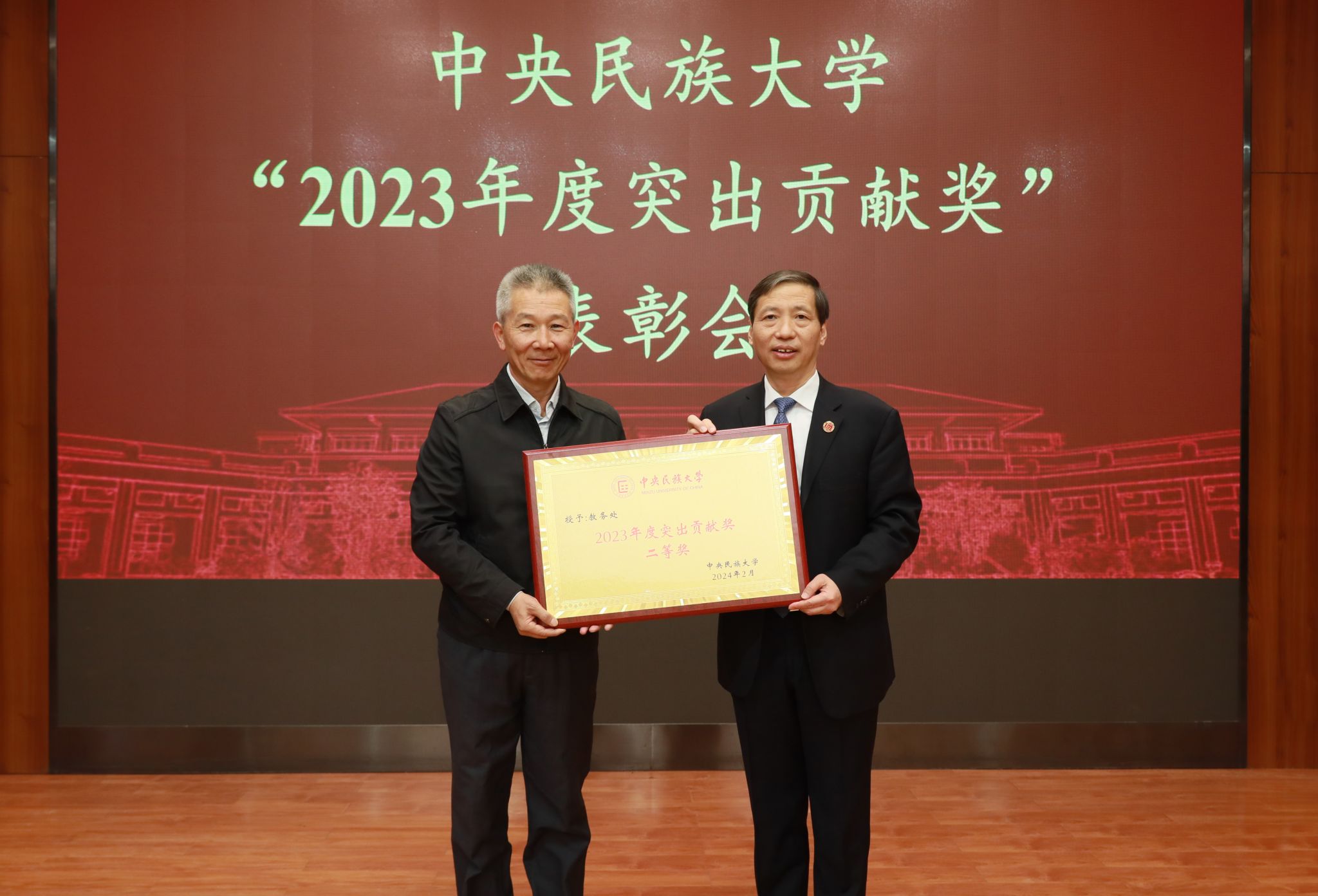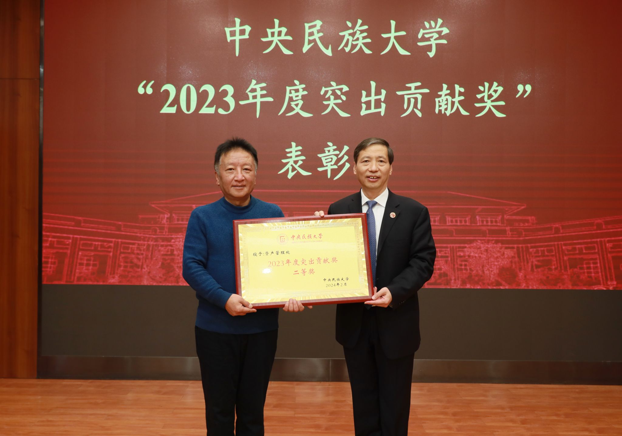 2023年,全校师生深入贯彻落实习近平新时代中国特色社会主义思想和党的二十大精神,坚持以铸牢中华民族共同体意识为主线,围绕“立德树人”根本任务,深化改革、开拓创新,有力推动了学校“双一流”建设,特别是在人才培养、民生工程等方面取得了突出成绩,为学校事业发展作出了重要贡献。校党委常委、副校长杨慕云宣读《威廉希尔中国官网关于授予教务处、资产管理处2个集体“2023年度突出贡献奖”的决定》,郭广生为获奖集体颁奖。